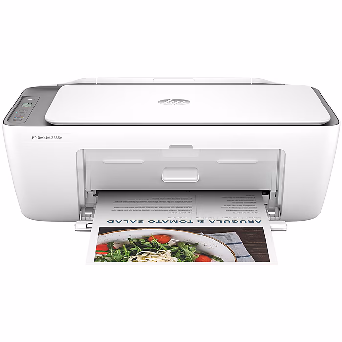 The HP DeskJet 2855e offers color printing, a 60-sheet paper tray, and a flatbed scanner for fast scanning and copying.
