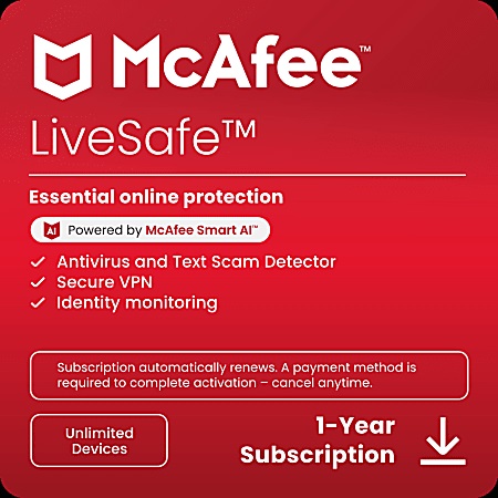 McAfee Livesafe offers award-winning anti-viruses with McAfee Smart AI™ and additional safety features such as fraud detectors, secure VPNs, and identity monitoring to keep your devices safe. Enjoy the peace of mind that your device is protected from fraud, viruses, malware and online threats.